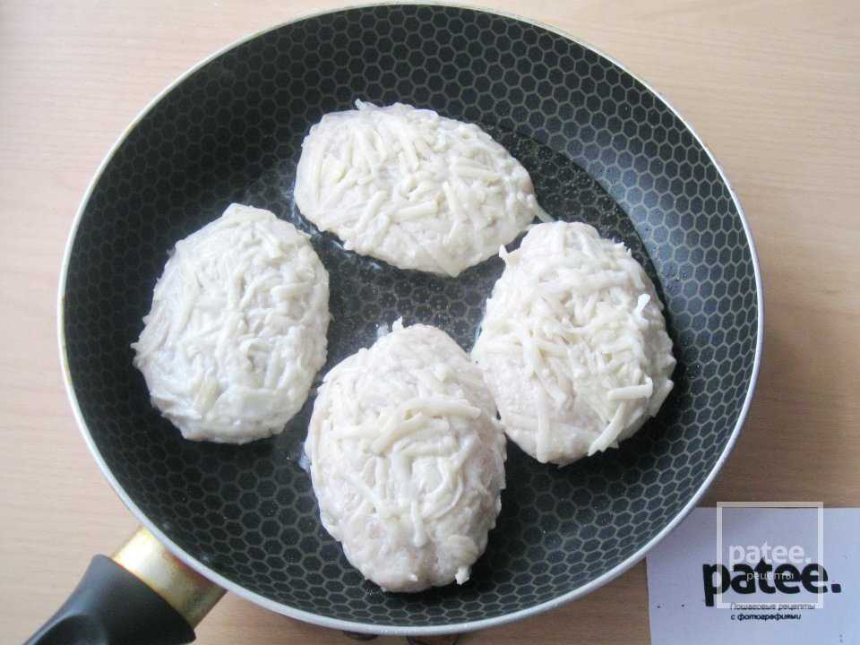 На горячую сковороду наливаем подсолнечное масло и кладем котлеты. Жарим с одной стороны.