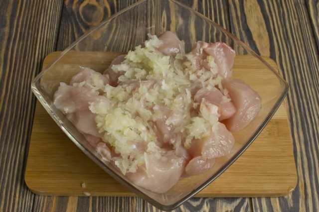 Хорошо перемешиваем мясо и специи, чтобы луковый сок, чеснок и перец впитались в курицу.