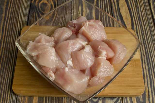 Охлаждённое куриное филе нарезаем большими кусками. Курица готовится быстро, поэтому, чтобы мясо сохранило сочность, мельчить не нужно, размер кубиков примерно 3 сантиметра.