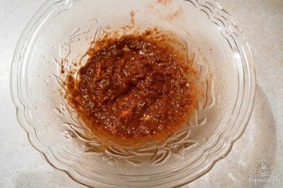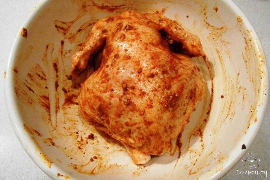 Натереть курицу маринадом и снаружи, и внутри. Оставить мариноваться на 1 час в холодильнике.