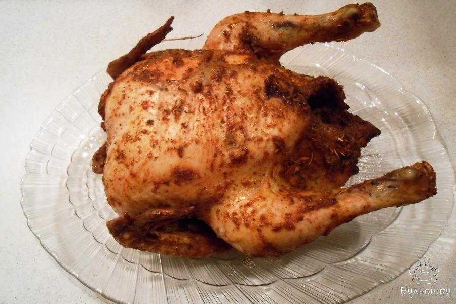 Теперь натираю приготовленным маринадом всю курицу, оставшуюся жидкость выливаю на дно емкости, в которой находится курица. Опять оставляю курицу в холодном помещении или холодильнике на 3-4 часа.