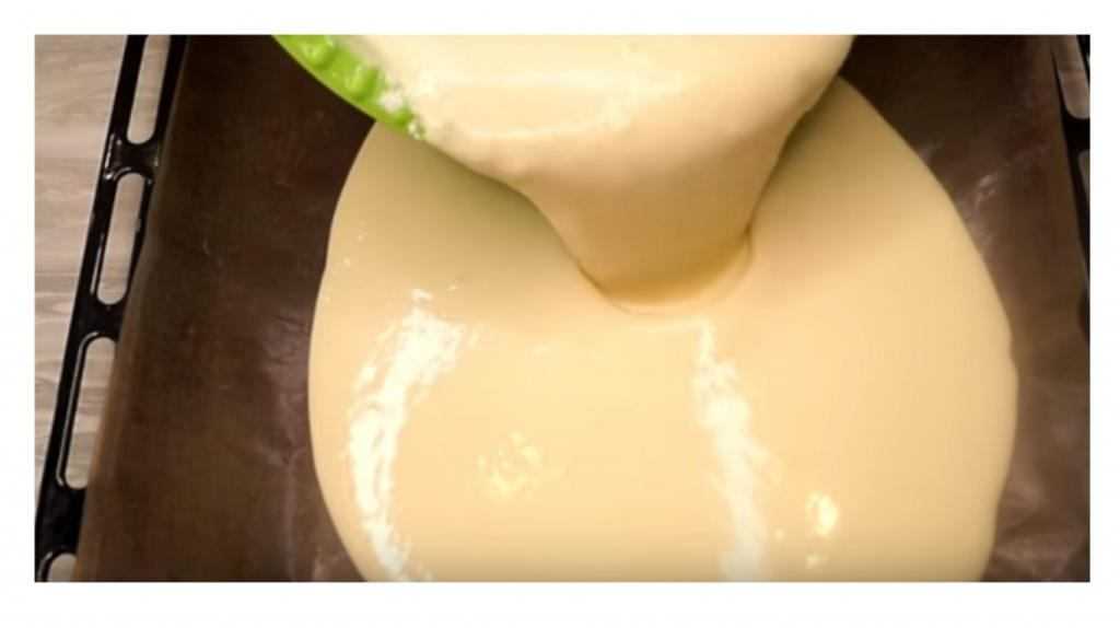 «Ленивым» этот рецепт называется потому, что пыхтеть со сковородкой, тонко распределять, жарить и переворачивать тут ничего не надо. Переливаем тесто на противень и на полчаса отправляем в духовку, разогретую до 180 градусов. Примерно так, кстати, изначально пекли и блины в русской печке.