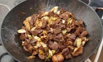 Рецепт «Острый вок с курицей и лемонграссом»: Мелко нашинковать мягкую часть стеблей лемонграсса. Лук нарезать полукольцами. Перец нарезать тонкими ломтиками от четвертинок.
