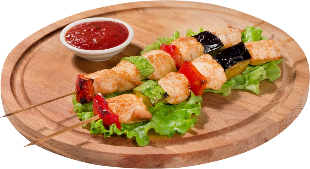 - Готовое мясо нанизывают на шампуры и обжаривают со всех сторон до готовности. Когда появится небольшой румянец, курица готова.