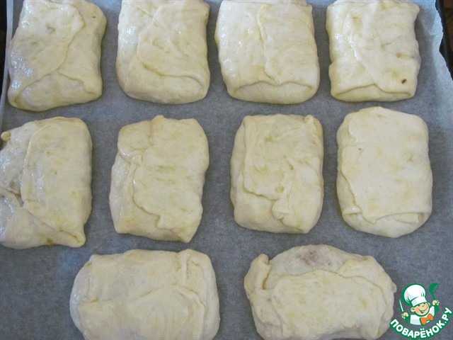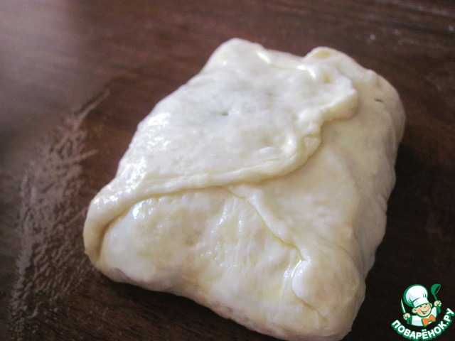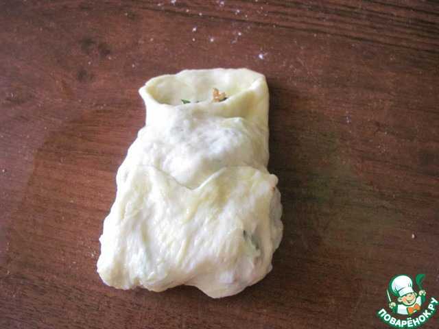 И начинаем его заворачивать. Сложить левый, затем правый край теста. Если тесто суховатое, смачивайте его маслом.