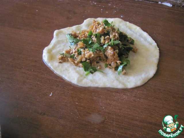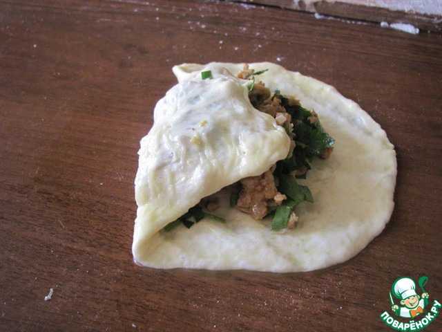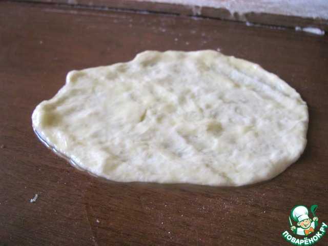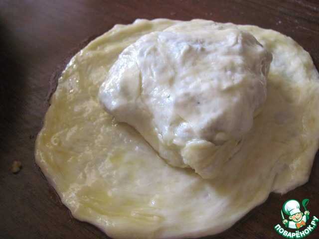 Берём ещё один шарик и проделываем ту же процедуру: смочили в масле, на столе пальцами распластали его до тонкого блинчика и на него кладём швом вниз наш блин с начинкой.