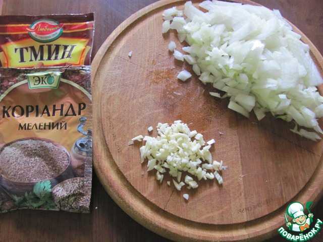 Теперь приступаем к приготовлению начинки:лук режем маленькими кубиками, чеснок мелко измельчаем. На сковороду наливаем растительное масло и обжариваем на нём чеснок с луком. Сразу добавляем все специи: тмин, кориандр и паприку.
