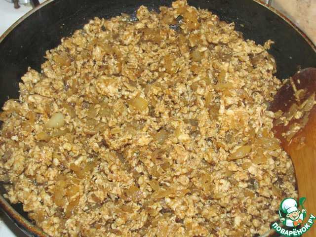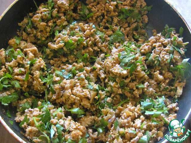 К зажарке добавляем фарш и обжариваем его до готовности, постоянно мешая, чтобы не было комочков, 5-10 мин. Солим и перчим по вкусу и добавляем мелко нарезанную петрушку.