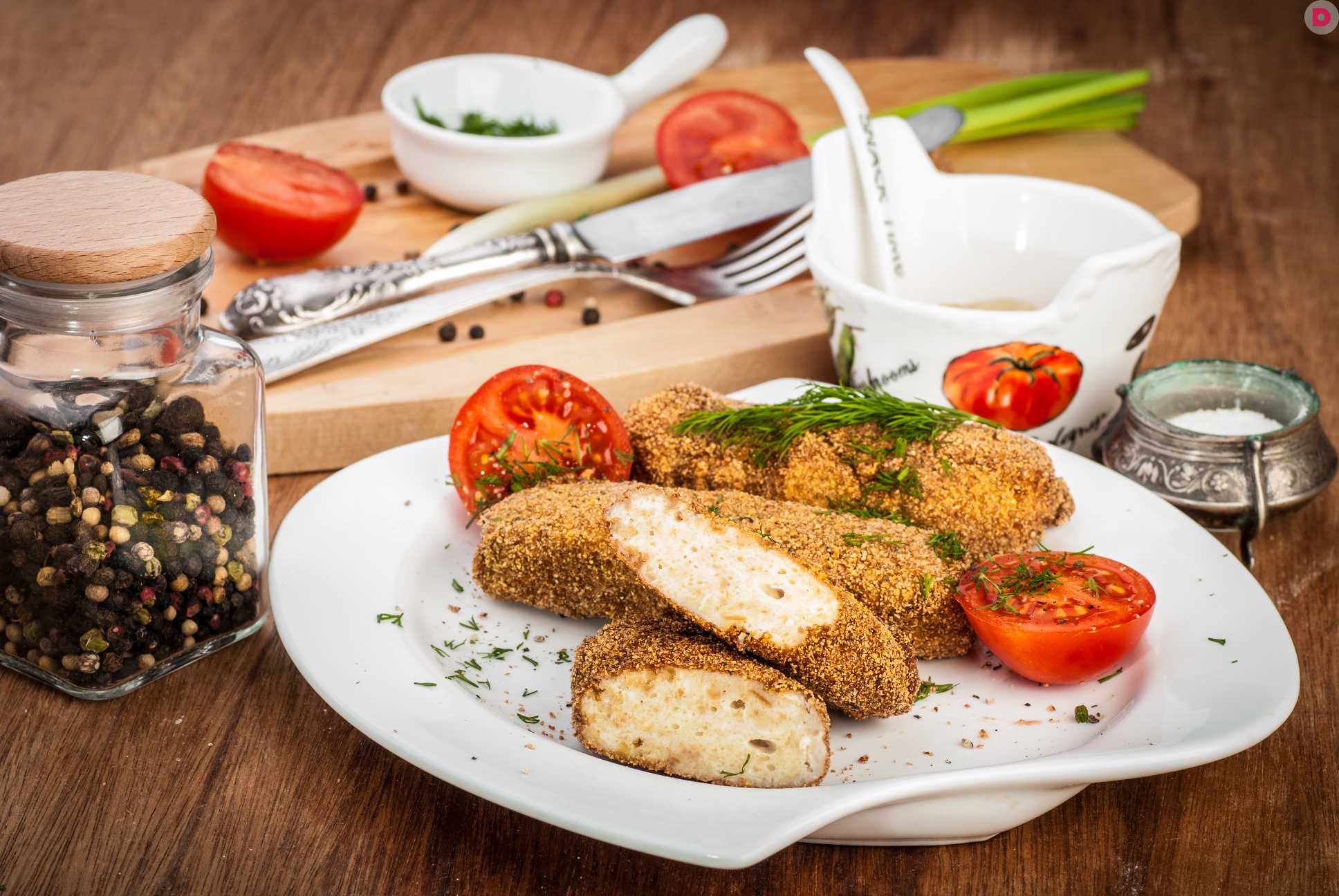 - Отбивают основу кушанья, формируют из нее заготовки, панируют их в сухарях и жарят на жиру до румяности.
