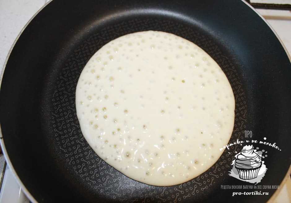 Выкладываем панкейк на разогретую сковороду, ждем пока не появятся пузырьки, осторожно переворачиваем, доводим до готовности.