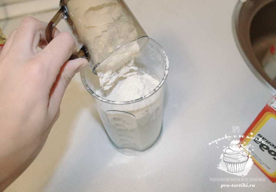 4. Просеять муку и также в несколько партий ввести ее в полученную смесь. Каждую новую порцию тщательно перемешивать до исчезновения комочков.