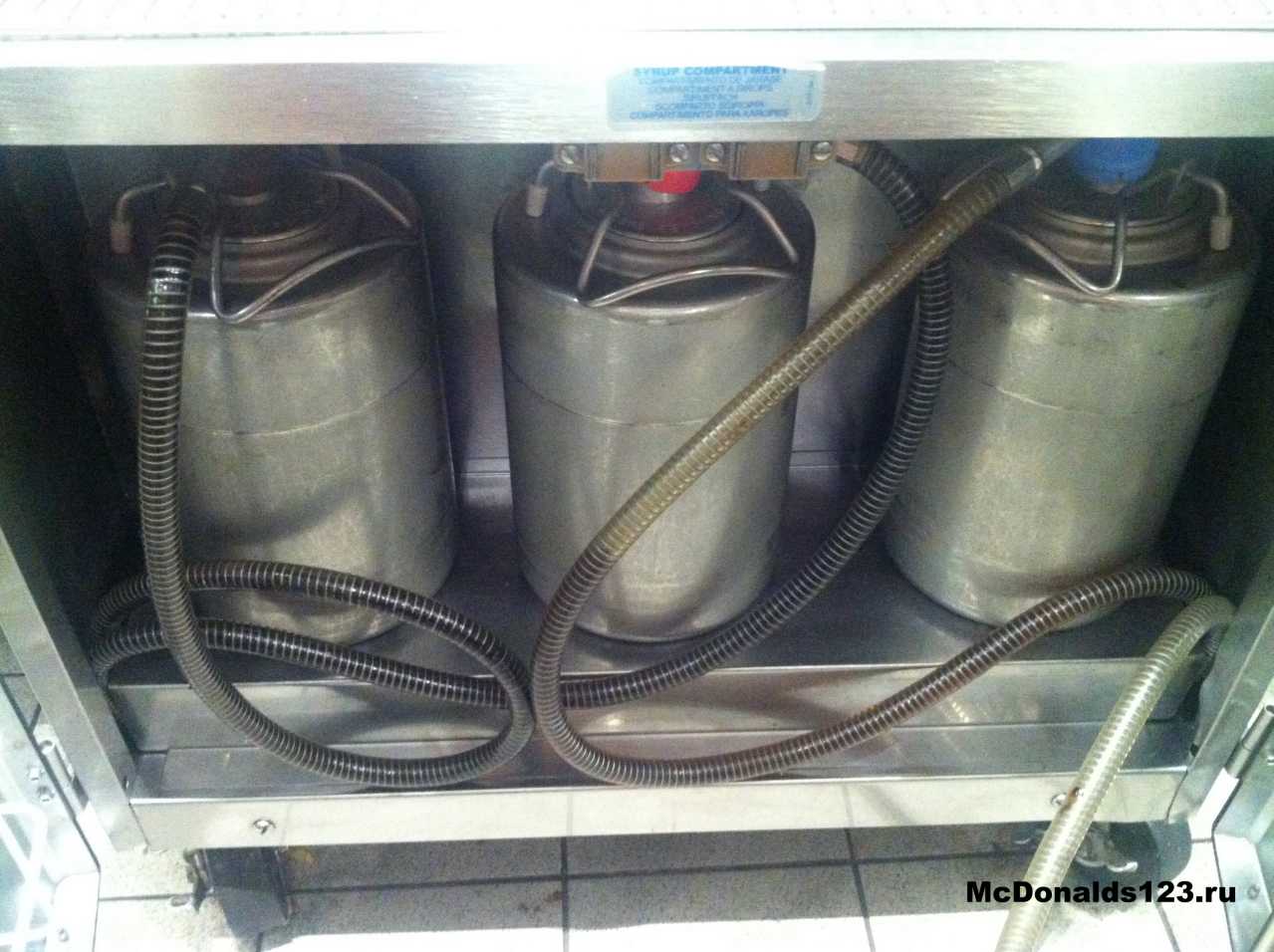 Посетителям ресторанов не видны емкости с сиропами, они расположены снизу за небольшими черными дверцами. Из каждого баллона выходит шланг по которому насос качает сиропы к месту выхода уже готового продукта. Разноцветные колпачки помогают определить работнику какой сироп в баллоне.