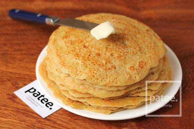 Готовые морковные блины с овсяными хлопьями складываем в стопочку, каждый блин по мере снятия со сковороды смазываем сливочным маслом.