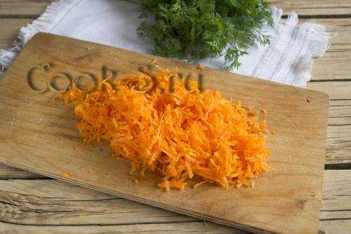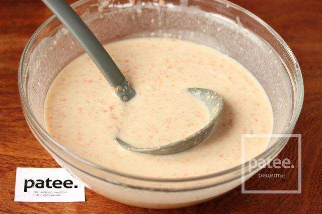На мелкой терке натереть 1 крупную морковь, добавить морковную стружку в тесто.