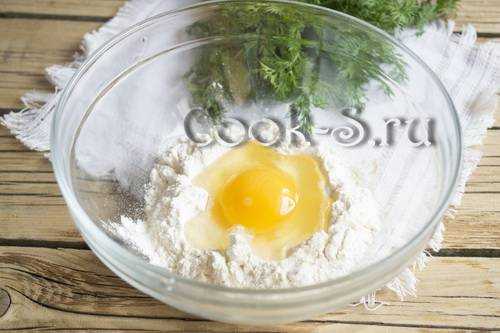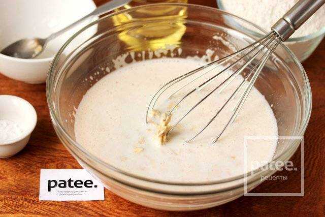 Затем вводим в тесто для морковно-овсяных блинов пшеничную муку, просеянную с пищевой содой.