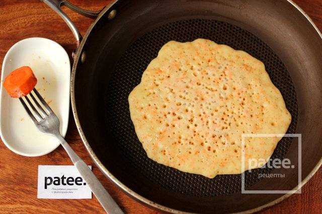 С помощью половника вылить небольшое количество морковного теста, вращая сковороду, распределить его по всей поверхности. Жарить блины с двух сторон примерно по 2 минуты.