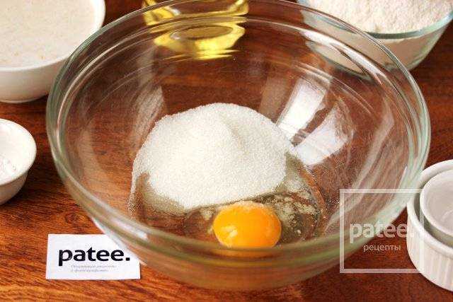 Всыпаем сюда же сахар. Взбиваем венчиком или миксером яйцо с сахаром до получения пышной светлой массы.