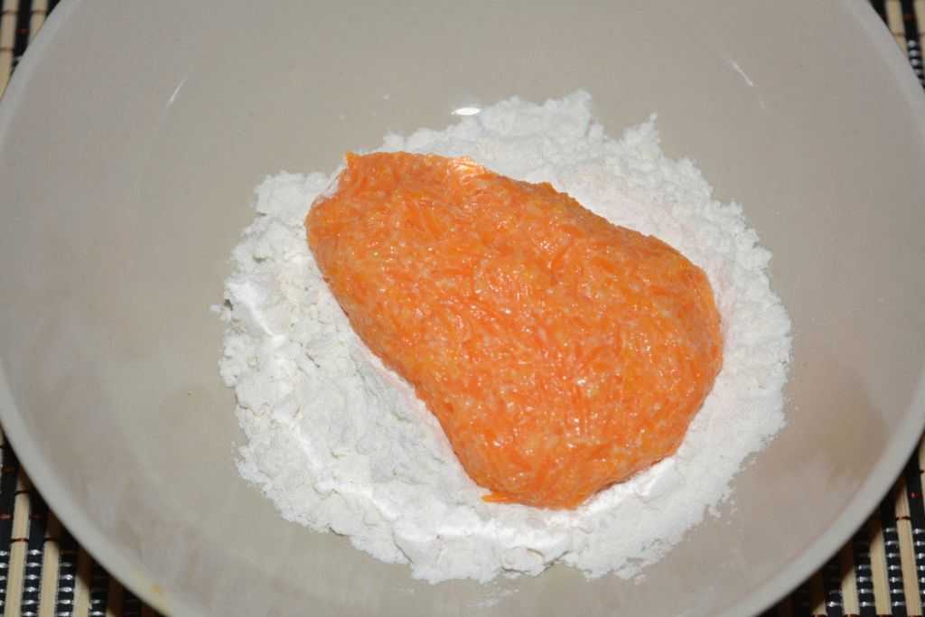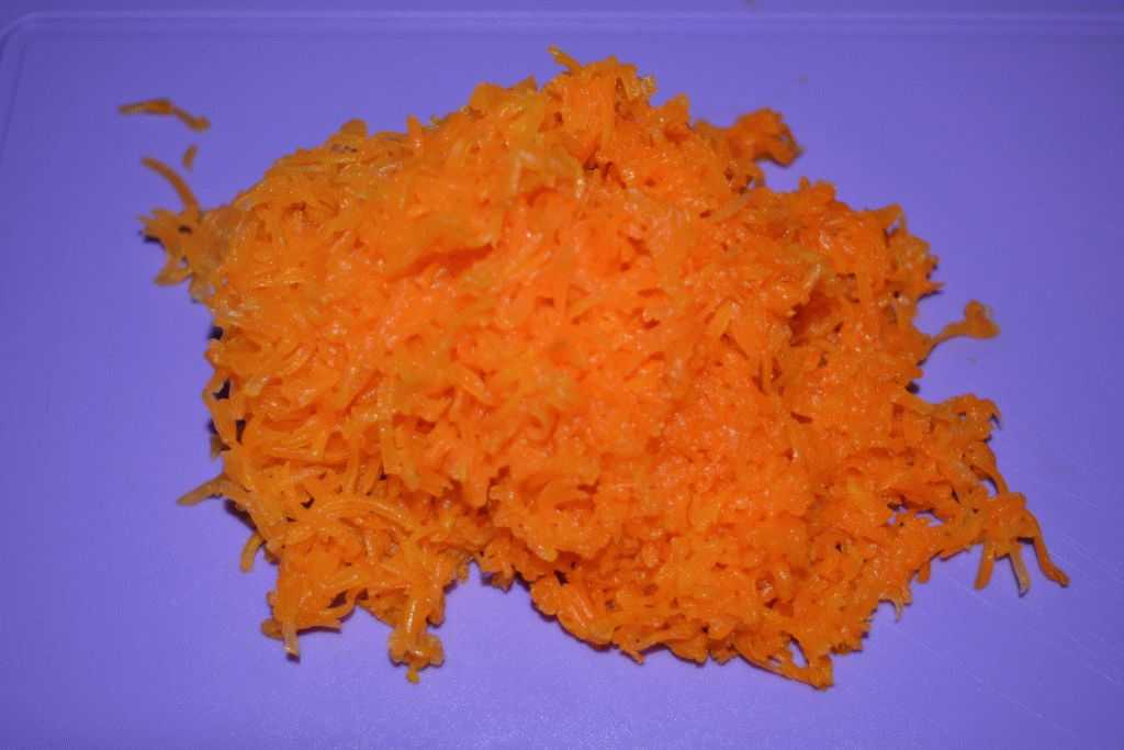 А пока можно заняться подготовкой морковного фарша. Овощ потереть на самой мелкой терке. Посолить и, слегка отжав, слить жидкость.