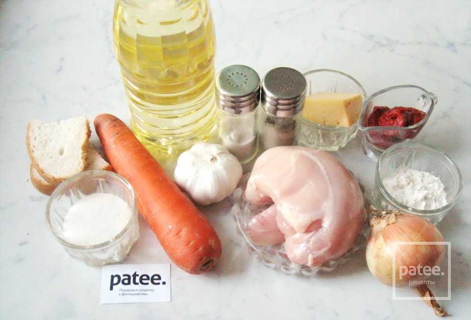 Для того, чтобы приготовить котлеты с морковью и сыром в томатном соусе понадобятся следующие ингредиенты: филе куриной грудки, лук репчатый, чеснок, морковь, сыр твердый, белый батон, соль, перец черный молотый, мука, подсолнечное масло, сахар, томатная паста.