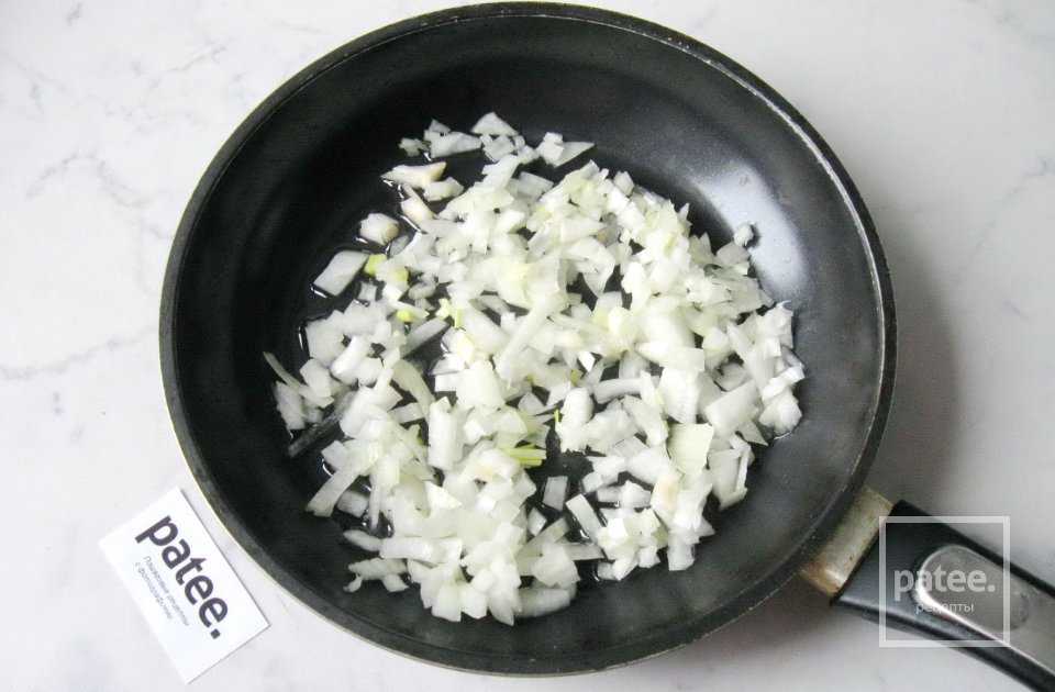 Одну среднюю луковицу очищаем и моем. Нарезаем мелкими кубиками. Кладем на сковороду.