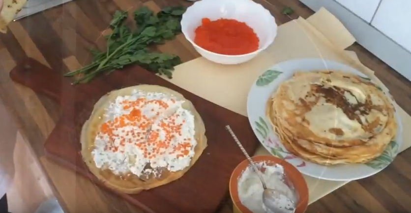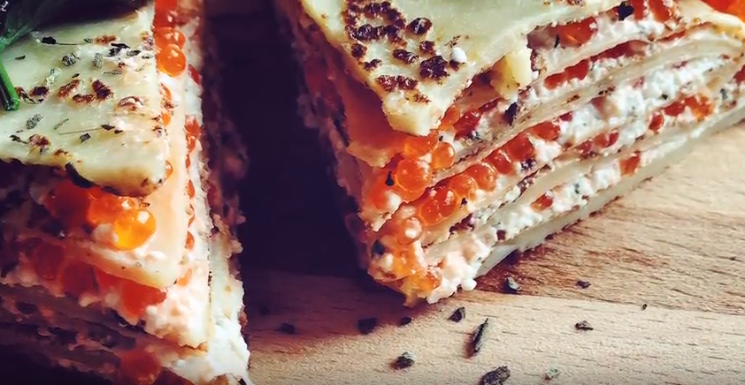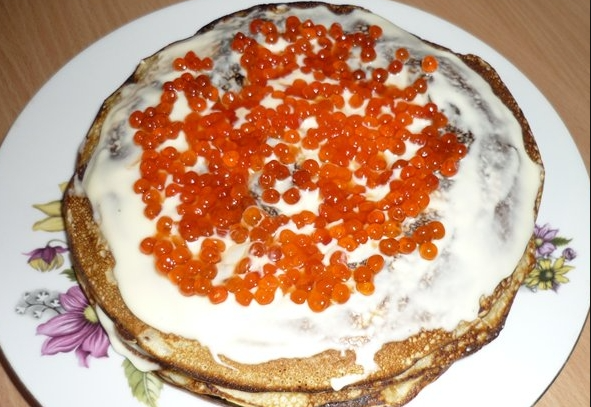 Блинный торт с творожной начинкой и красной икрой пошагово с фото