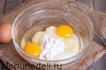 В другой миске взбейте яйца с жирной сметаной. У меня сметана домашняя, но если бы я брала магазинную, то остановилась бы на жирности 20-21 %.
