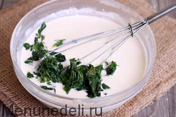 Добавьте зеленую часть в тесто, перемешайте и проверьте его консистенцию. Если тесто напоминает вам густой кефир, значит, вы сделали все верно. Если густовато – подлейте еще немного пива.