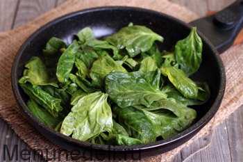 Удалите стебли у шпината, предварительно хорошо вымыв зелень. Сложите листья на сухую раскаленную сковороду, накройте крышкой и готовьте 3 минуты, не больше. Кстати, если нет шпината, вполне подойдет руккола.