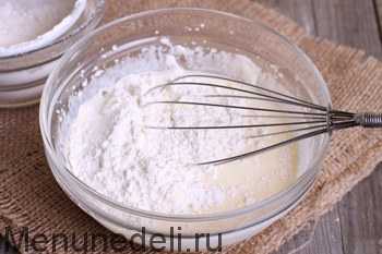 Очень важно всыпать муку постепенно, так вы избежите, образования комочков в тесте, которые, порой достаточно тяжело вымесить.