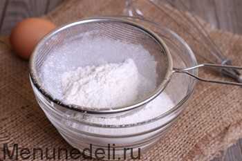 - Просеять муку через сито. Добавить взбитые яйца и растительное масло с сахаром.