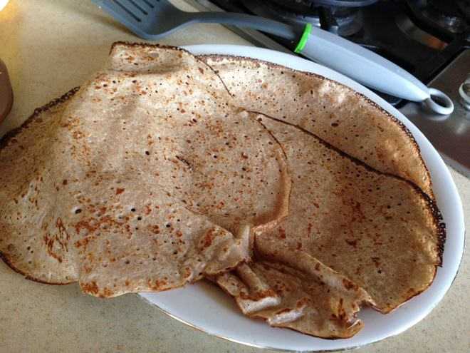 Готовятся они быстрей «толстых» блинов. Когда на видимой части выпечки появляются дырочки и пузыри — переворачиваем.