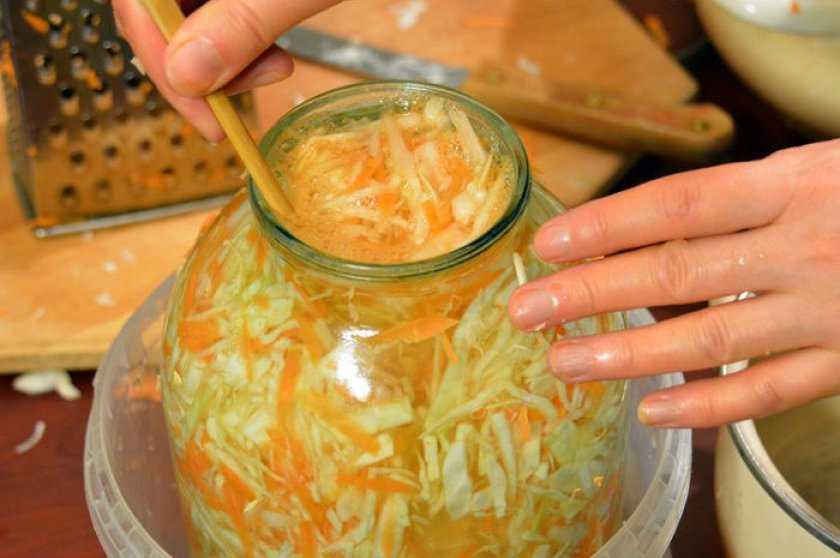 При закладке в банку или другую емкость нужно очень плотно утрамбовать капусту, чтобы она отдала максимум сока.