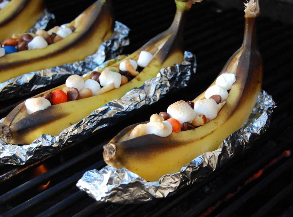 - Уплотните фольгу вокруг банана, оставляя сверху отверстие шириной 5-7 см. Положите лодочки на решетку мангала и выпекайте 8-10 минут.