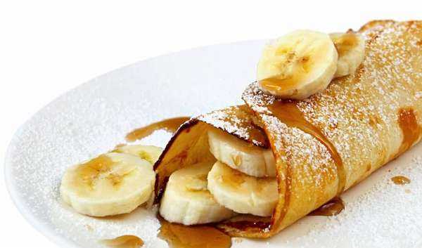 - Один банан порежьте кружочками, крупно измельчите 10 грамм фундука или других орехов. На блинчик положите сначала порезанный фрукт и орехи, затем полейте медом и посыпьте молотой корицей.