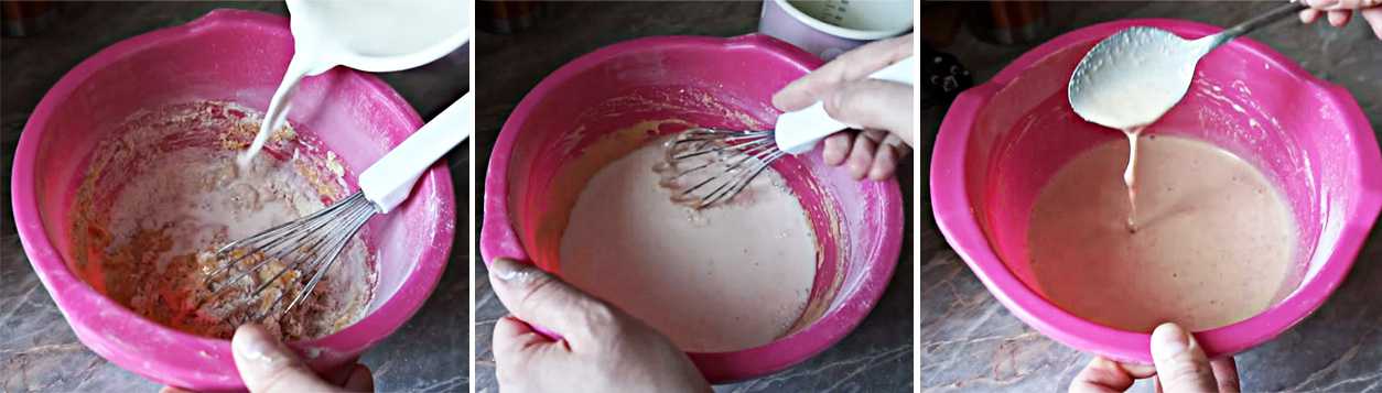 4. Начинайте понемногу подливать молоко и продолжайте активно смешивать ингредиенты. Таким образом влейте все молоко и размешайте до однородной массы. Тесто получается жидким.