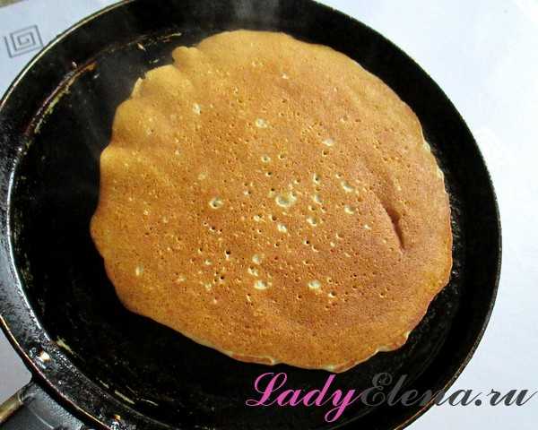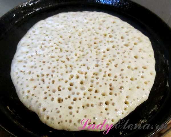 Смажьте сковороду с помощью кисточки маслом (или воспользуйтесь бумажной салфеткой), накалите её на среднем огне. Налейте порцию теста на середину. Быстро, меняя положение сковороды круговым движением руки, сформируйте из теста круг. Через некоторое время поверхность блинчика покроется крупными дырочками.