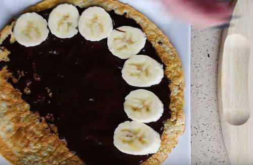 - На половину овсяноблина добавить нарезанный банан и щепотку корицы. Сложить его пополам или свернуть трубочкой.