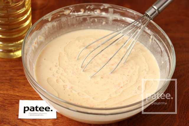 - Смазанную растительным маслом сковороду раскалить и вылить на нее тесто.
