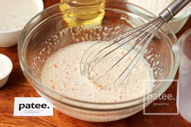 - Затем в эту смесь влить молоко и перемешать до растворения сахара и соли.