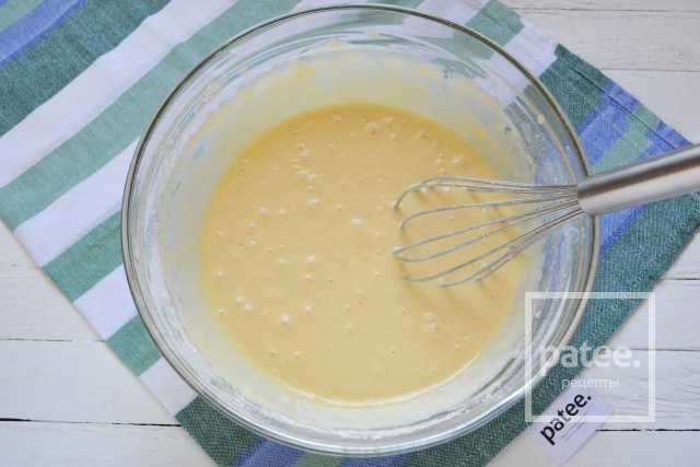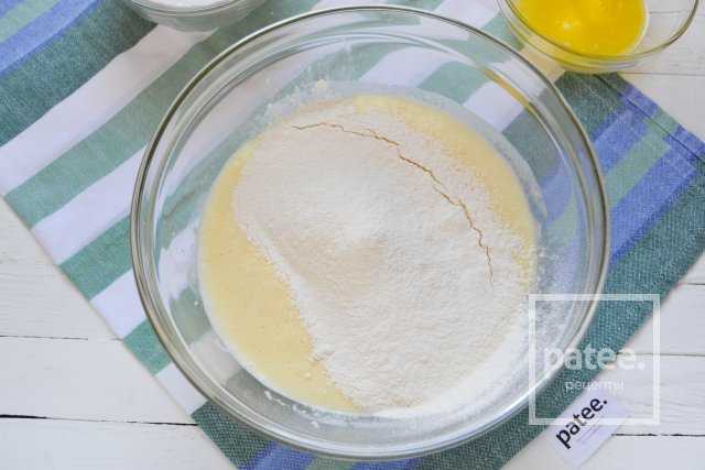 - Постепенно всыпайте мучную смесь к жидкой составляющей теста.