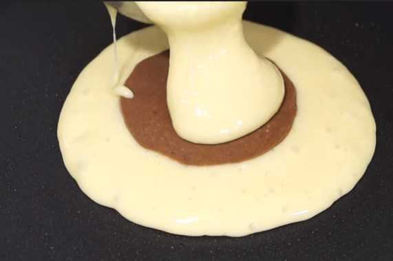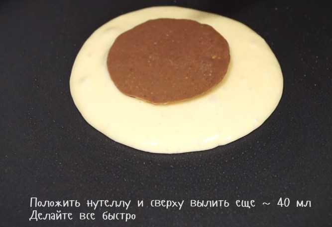 На сковородку налить немного теста и выложить порцию нутеллы. Затем залить нутеллу тестом.