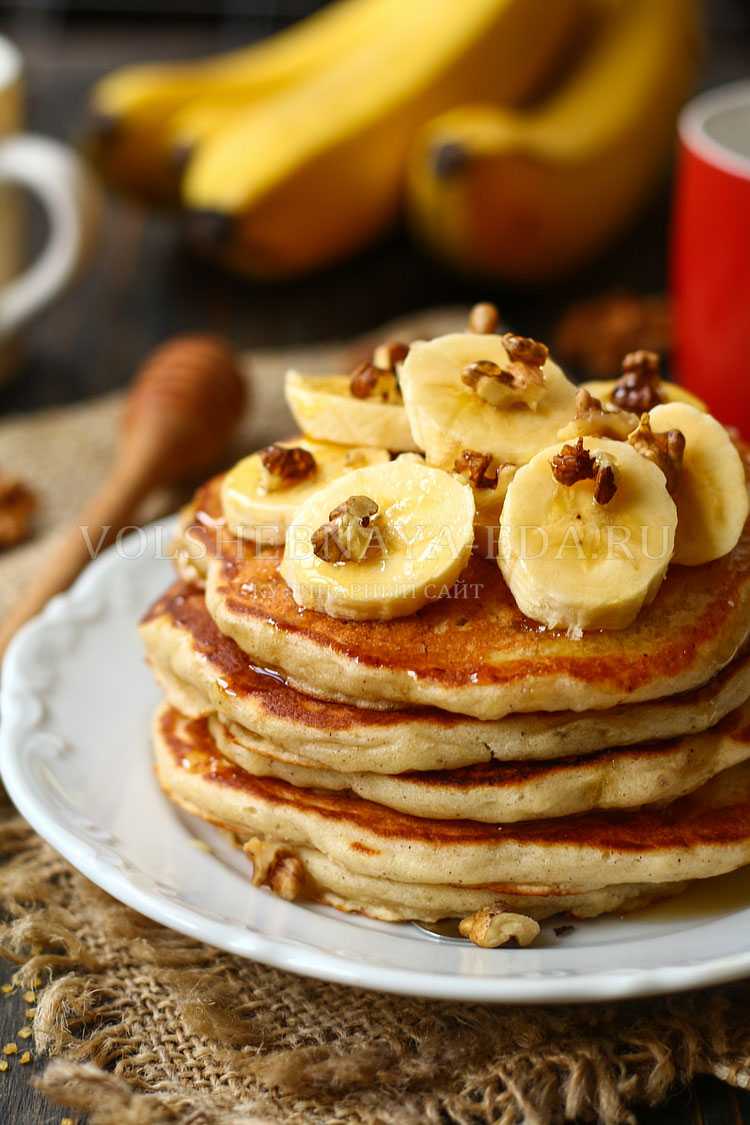 - Готовые панкейки складывать стопочкой на тарелку, чтобы они медленнее остывали. При подаче можно украсить кусочками банана и орехами, различными джемами или конфитюрами, полить медом, сметаной, сгущенкой, сладкими сиропами.