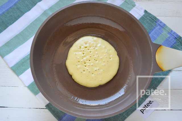 - Разогреваем сковороду и выкладываем на нее примерно пол половника теста в центр. Оно растечется в небольшую круглую лепешку. Уменьшаем огонь и ждем, когда появятся пузырьки на поверхности. Можно на несколько секунд накрыть крышкой, чтобы блинчики увеличились в объеме.