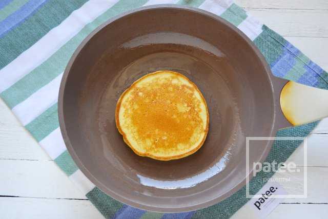 - Обжаривайте панкейки по 2–3 минуты с каждой стороны. Как только низ зарумянится и появятся пузырьки воздуха, сразу переворачивайте.