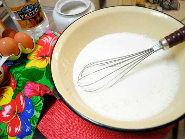 Необходимо налить кефир в кастрюлю или сотейник и поставить на небольшой огонь. Сразу в жидкость следует всыпать соду. Её не нужно предварительно гасить, поскольку этот процесс происходит при взаимодействии порошка с кислотами кефира (сода не будет чувствоваться в готовом блюде). Когда жидкость нагреется, то над ней поднимется пышная шапка из пены. Именно после её появления необходимо снять посуду с огня.