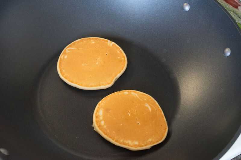 - На среднем огне разогреть сковородку с толстым дном. Традиционно панкейки выпекаются без жира, но если используется сковорода без антипригарного покрытия, лучше смазать ее тонким слоем растительного масла.