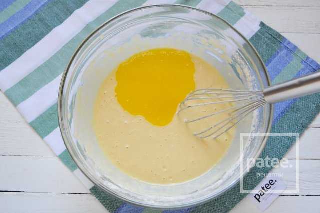 - Растопленное и остывшее до температуры тела сливочное масло тоненькой струйкой влейте в тесто. Еще раз все аккуратно перемешайте.