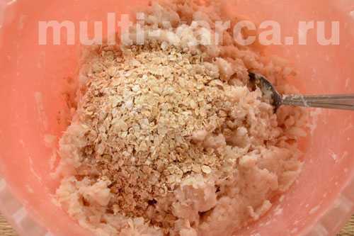 3. Далее отмеряем и кладем овсяные хлопья и опять все смешиваем, чтобы геркулес равномерно распределился по фаршу. Накрываем чашу пищевой пленкой и даем отдохнуть и хлопьям немного набухнуть.