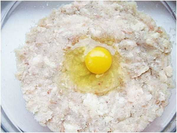 - Положить в рыбный фарш размоченную булку и разбить яйцо.