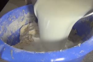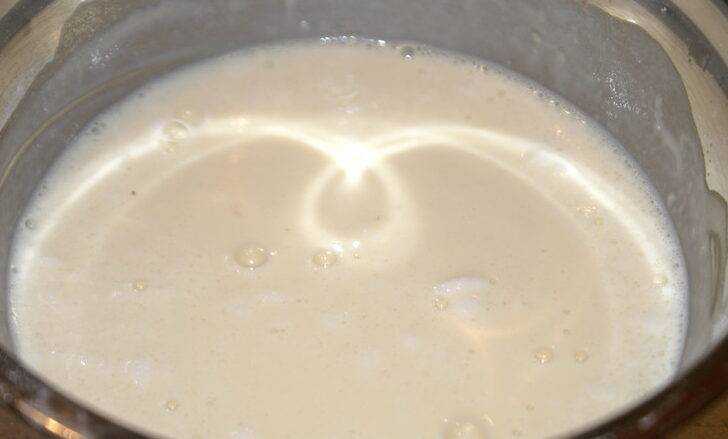 3. Молоко разогреваем до хорошо горячего, но не кипятим (80 градусов) и заливаем в смесь. Размешиваем в миксере, оставляем для брожения. Тесто должно увеличиться в два – три раза.